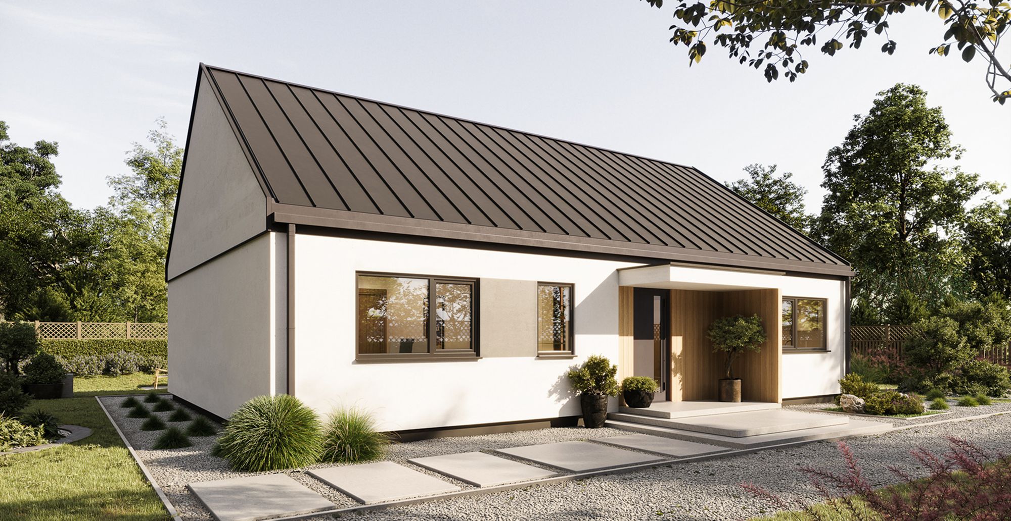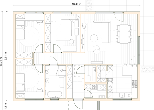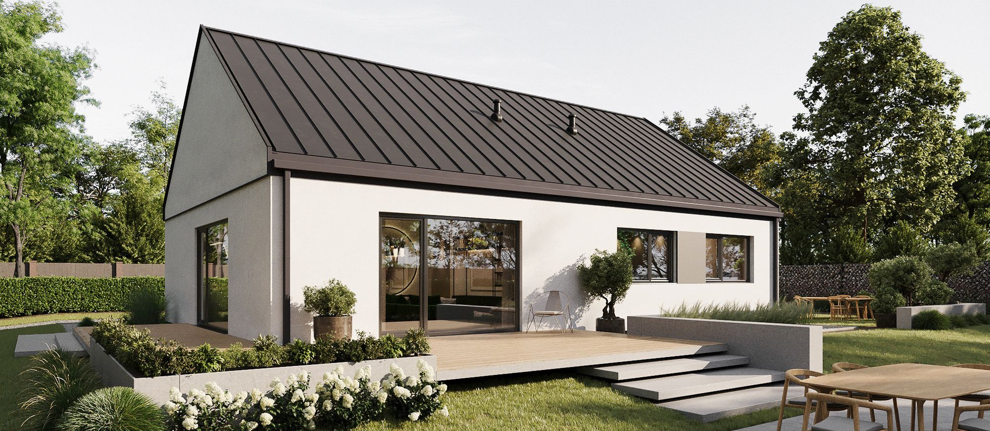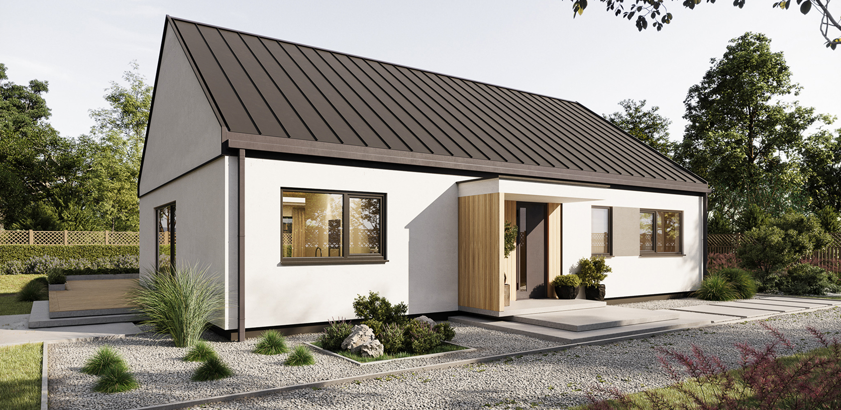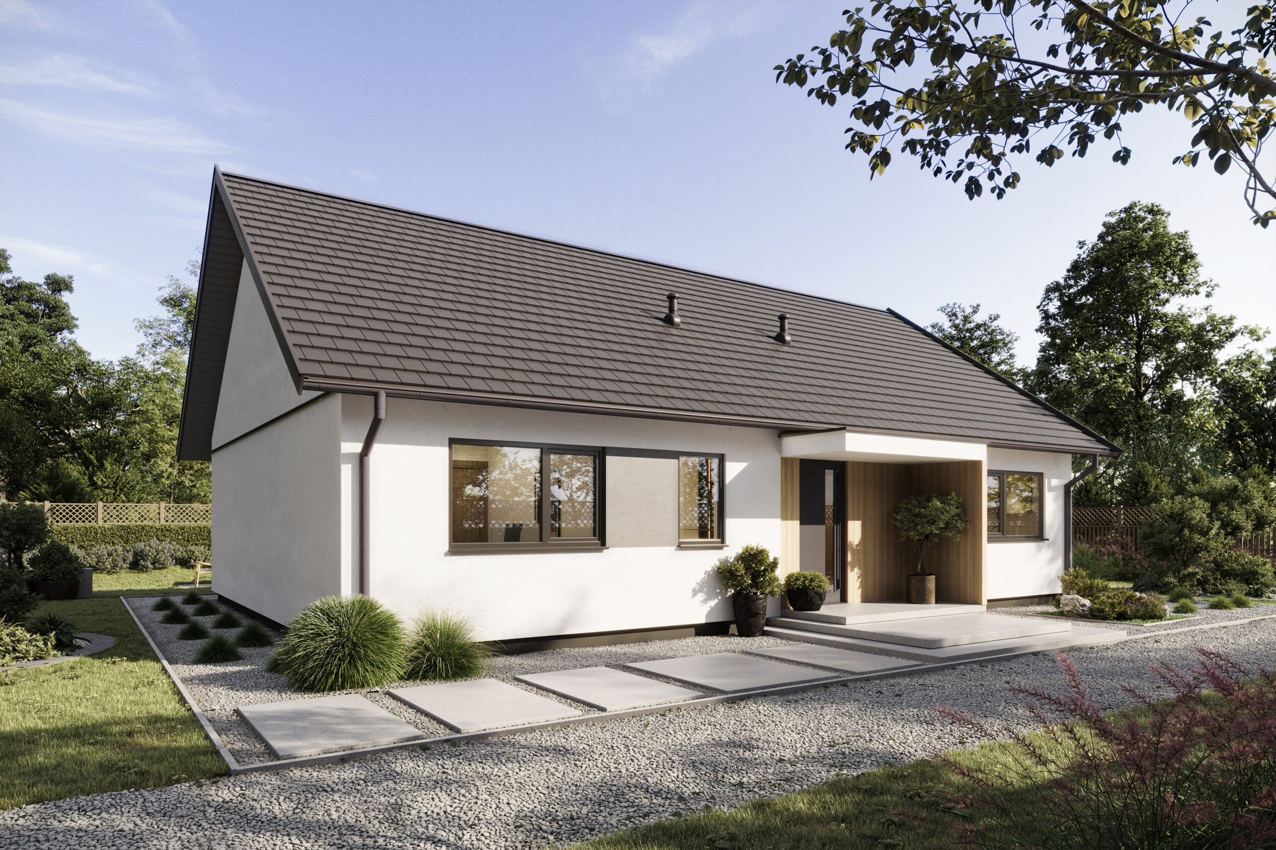 Funkcjonalny, parterowy dom o powierzchni 111 m², zaprojektowany z myślą o rodzinie 2+2 lub 2+3. Przemyślany układ pomieszczeń, duża strefa dzienna i trzy niezależne sypialnie gwarantują komfort życia na co dzień, a technologia prefabrykacji pozwala na szybki montaż i precyzyjne wykonanie. Dom występuje w wersji bez okapu, co nadaje mu nowoczesny, minimalistyczny charakter i podkreśla prostą bryłę budynku. Ten model to idealny kompromis między rozmiarem a ergonomią – bez zbędnych metrów, ale z pełnym zestawem funkcjonalności. Dom można zamówić w wersji lustrzanego odbicia. Istnieje również możliwość zmiany pokrycia dachowego na dachówkę betonową lub ceramiczną.