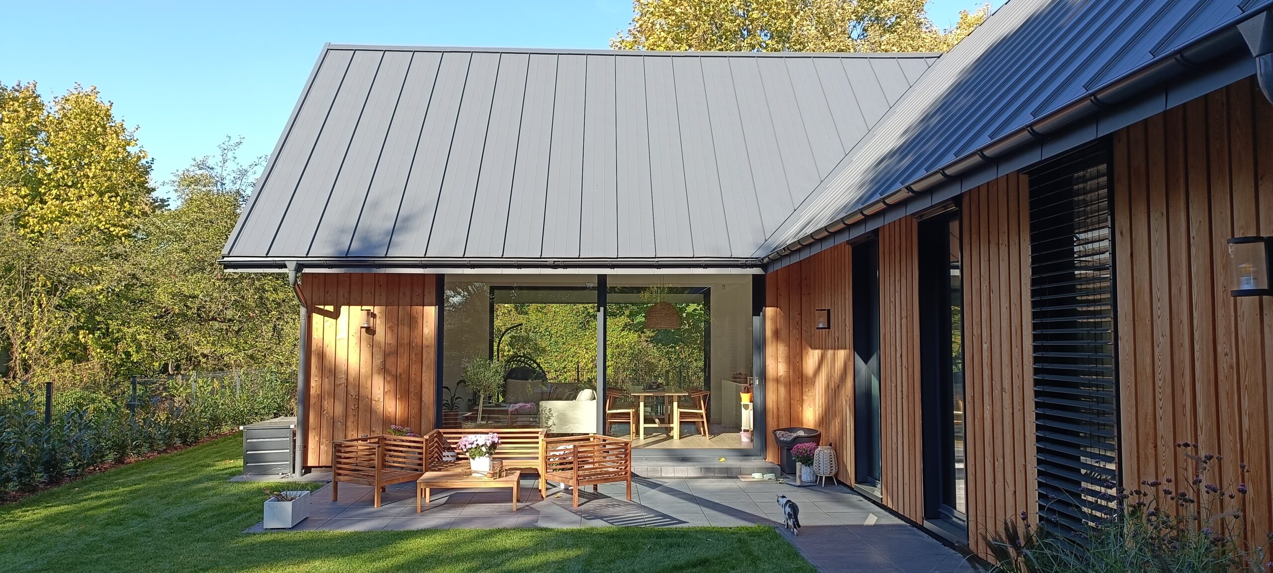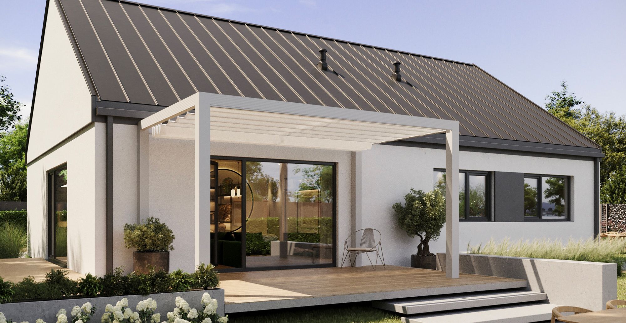 Drewniana pergola, którą można dostosować do wielu funkcji – od letniego salonu po zewnętrzne biuro lub jadalnię. Stanowi estetyczne i praktyczne uzupełnienie ogrodu, wpisując się w nowoczesną, oszczędną formę architektury głównej bryły.