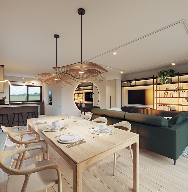 Dom pod klucz to gotowe do użytkowania rozwiązanie dla osób, które chcą wprowadzić się do nowoczesnego domu energooszczędnego bez nadzorowania prac wykończeniowych. Budynek jest w pełni wykończony, z tynkami, podłogami, drzwiami, instalacjami i łazienkami. Klient sam dobiera meble i wyposażenie kuchni, zachowując możliwość spersonalizowania wnętrz.